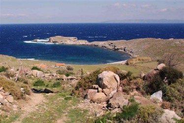 überraschte uns mit Lammkoteletts und etwas Huhn, geröstet am offenen Herd (die leckerste Zubereitungsart). Dann konnten wir noch feststellen, dass es bei Costas bessere Keftedes (Hackbällchen) als in der Taverne Perikles, Molyvos, gibt, obwohl – glauben Sie mir – die dort schon großartig sind. Über die gesamte Insel wehte eine strenger Wind, und die Dünen von Kampos erschienen uns wie Wanderdünen. Sie waren all überall auf der Straße, und es kam uns so vor, als würde das für Griechenland seltene Dünengebiet