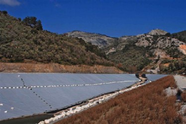 Kurz bevor man die Quelle des Sedoundas erreicht, fährt man eine scharfe Kurve und kann dahinter den neuen Stausee von Plomari sehen. Na ja, Stausee... Er trägt halt nur ein klein wenig Wasser in sich. Seit Jahren nun arbeitet man daran, aber eine Fertigstellung ist nicht in Sicht. Was man sieht, ist ein großes Becken, das mit Plastik ausgekleidet ist. Diese Abdeckung wird mit Säcken und Steinen fest positioniert, die wiederum mit Tauen miteinander verbunden sind. Ich weiß ja, das Griechen Plastik lieben... aber, ob das der richtige Weg ist,