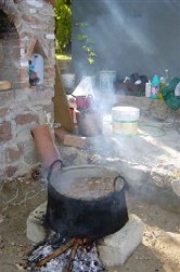 zum weiteren Trocknen ab in den Ofen. Aufbewahrt werden die Feigen zwischen Lorbeerblättern, um Ungeziefer fernzuhalten. Die Feigen in Sirup einzukochen, ist eine andere Form des Einmachens: „Vrasma“ oder „Pettimessi“. Hierfür werden Unmengen an Feigen draußen in einem riesigen Topf auf offenem Feuer einen ganzen Tag gekocht. Danach erhält man einen herrlichen Sirup, der fantastisch zu Pfannkuchen schmeckt, aber die Griechen verwerten ihn, um damit köstliche Kuchen zu backen.