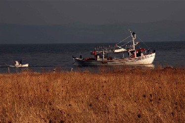 auf die Suche ging, damit sie zumindest etwas zu essen hatten. Es war ein wunderbarer warmer und sonniger Morgen. Es war windstill und auf dem Meer kreuzten einige Fischerboote so nah an der Küste, dass es aussah, als würde ihr Weg sie über die Felder führen. Ein perfekter Tag, wäre da nicht die Ungewissheit und Unruhe hinsichtlich der Flüchtlinge. Nach anderthalb Stunden traf dann endlich die Polizei ein. Sie kamen aus Kalloní, denn während der Nachtstunden, bis morgens 8.30, ist die Station in Molyvos nicht
