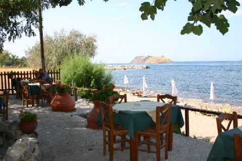 In schöner Lage, direkt an einem Sand-/Kiesstrand, kann man in netter Atmosphäre den Blick über das Meer genießen.