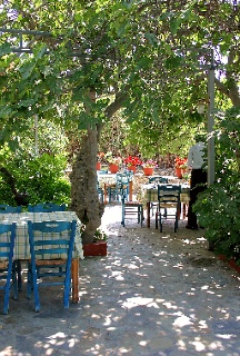 Die Holztische und die schöne alte Kafenion-Bestuhlung schaffen ein reizvolles Ambiente: eine „echt“ gebliebene Taverne.