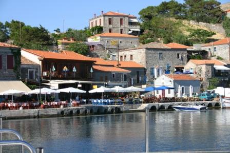 Im pittoresken Hafen von Molyvos (auf dem Foto da, wo die blauen Stühle stehen), findet man die schnuckelige Boutique.